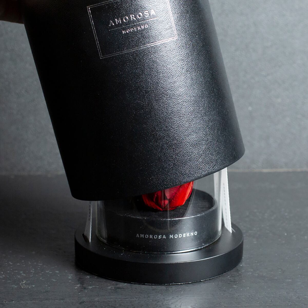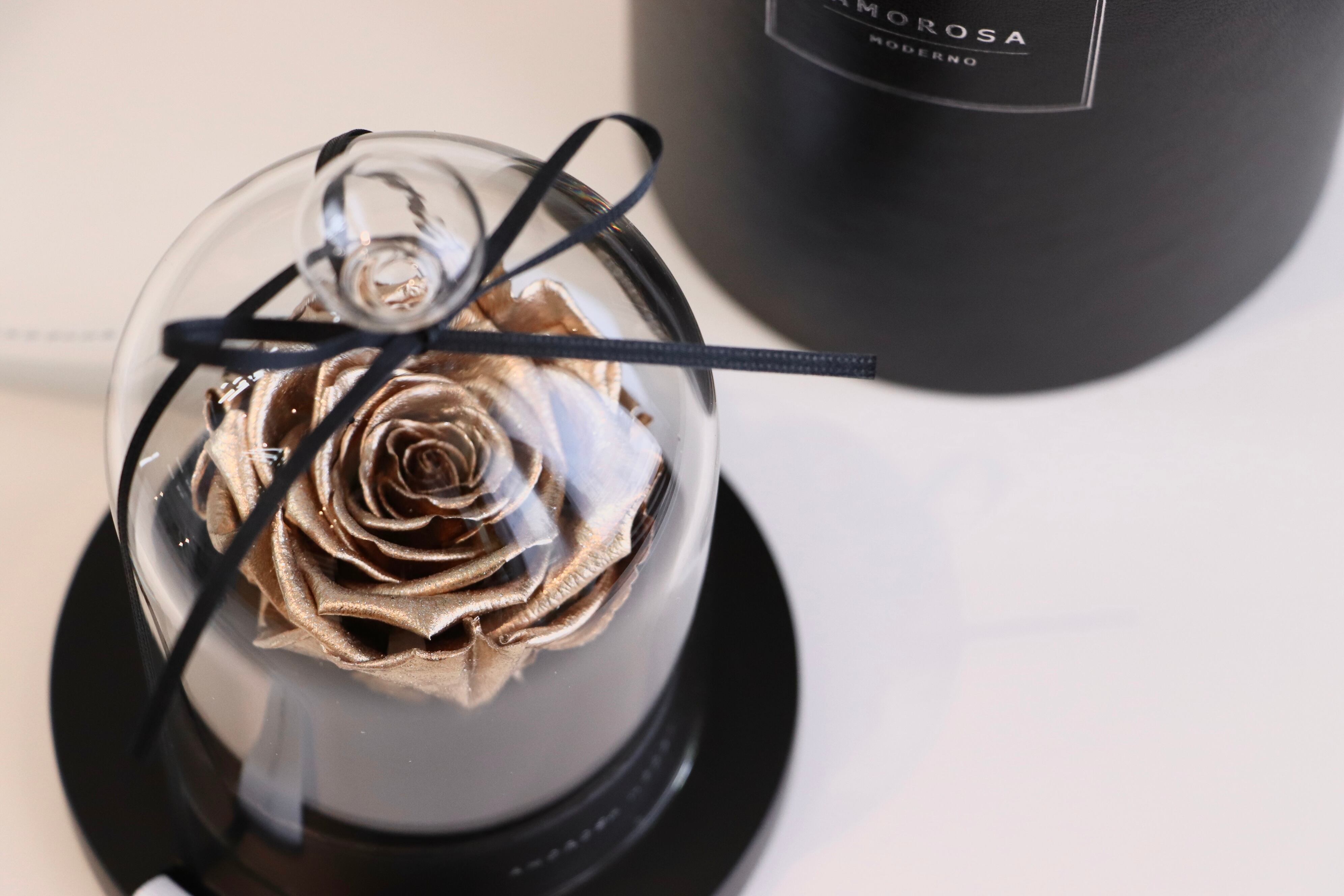 天然ダイヤモンドとラメが輝くプリザーブドローズを一輪ガラスドームにあしらいました。